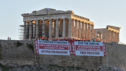 19 Eylül 2025 sabah erken saatlerinde koordineli bir şekilde olan mitingde KKE ve KNE üyeleri Akropolis’e çıkarak üzerinde Yunanca ve İngilizce yazılı 2 tane pano astılar. KKEnin panolarında şunlar yazıyordu: Soykırım hemen dursun. Katil devlet İsrail ile hiçbir işbirliği olmasın. ...